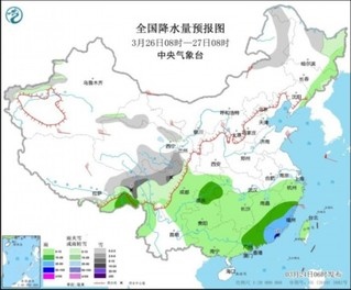 圖4 全國(guó)降水量預(yù)報(bào)圖(3月26日08時(shí)-27日08時(shí))