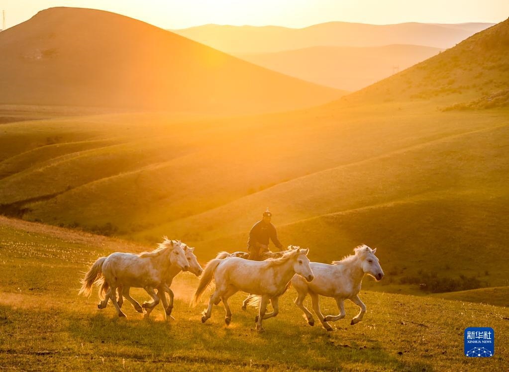 5月17日,錫林郭勒盟西烏珠穆沁旗的牧民在夕陽下馴馬。