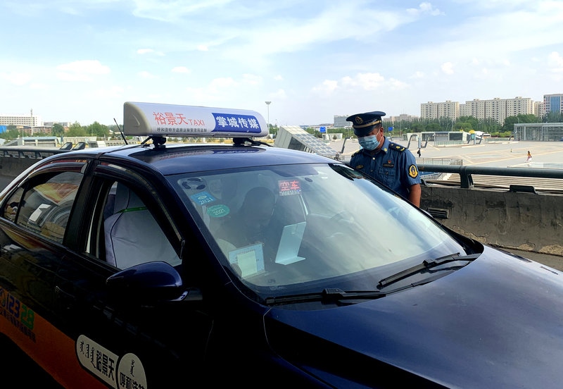 6月3日下午,呼和浩特白塔機(jī)場(chǎng),呼和浩特市交通運(yùn)輸綜合執(zhí)法支隊(duì)白塔機(jī)場(chǎng)中隊(duì)正在對(duì)機(jī)場(chǎng)接送客的出租車進(jìn)行檢查。