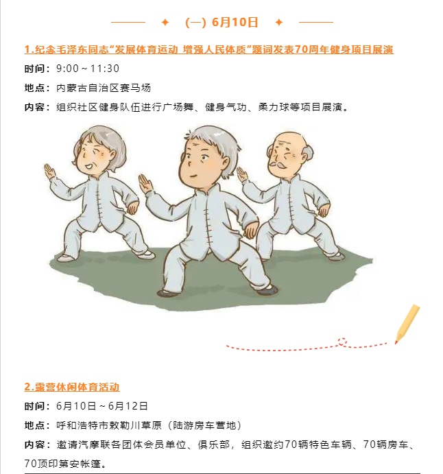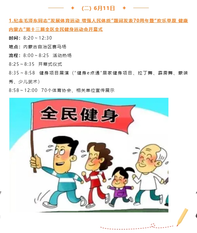 記者從自治區(qū)體育局獲悉,紀(jì)念毛澤東同志“發(fā)展體育運(yùn)動(dòng),增強(qiáng)人民體質(zhì)”題詞70周年暨“歡樂(lè)草原健康內(nèi)蒙古”第十三屆全區(qū)全民健身運(yùn)動(dòng)會(huì)將于6月10日至11日歡樂(lè)開(kāi)啟。