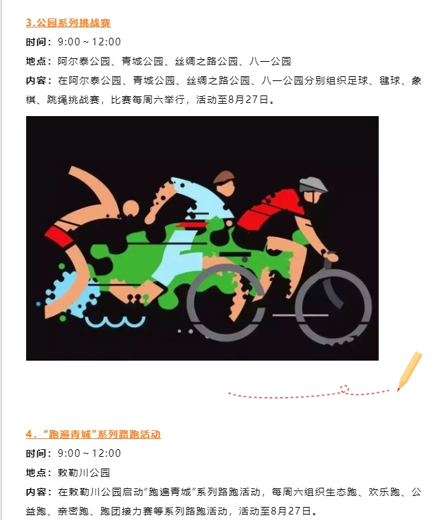 本次運(yùn)動(dòng)會(huì)認(rèn)真踐行“以人民為中心”辦賽理念,創(chuàng)新探索聚集少、規(guī)模小、符合大眾運(yùn)動(dòng)口味的內(nèi)蒙古賽馬場(chǎng)城市三項(xiàng)賽,包含跑步3000米、跳繩200個(gè)和動(dòng)感單車騎行5公里3個(gè)項(xiàng)目比賽。此外,還將舉辦公園系列挑戰(zhàn)賽、“跑遍青城”系列路跑活動(dòng)等,讓群眾在暢享運(yùn)動(dòng)的過(guò)程中盡情領(lǐng)略城市綠景的清新曼妙,進(jìn)一步推動(dòng)全民健身與全民健康深度融合。