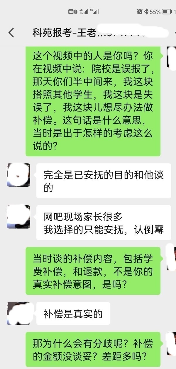 據(jù)樊女士介紹,負(fù)責(zé)給小安報志愿的是科苑報考的王金寶老師,也是內(nèi)蒙古科苑信息科技有限公司的股東之一。樊女士提供的視頻顯示,這名老師在網(wǎng)報志愿現(xiàn)場回復(fù)樊女士:“院校就是誤報了,因為那天你們是半中間來,還有其他學(xué)生,搭照學(xué)生,我這塊兒就失誤了,我這塊兒想盡辦法做補(bǔ)償?!比欢?,樊女士反映,那天以后,這名老師開始反口,不承認(rèn)誤報,也不愿意按照當(dāng)天商定的補(bǔ)償方案執(zhí)行。