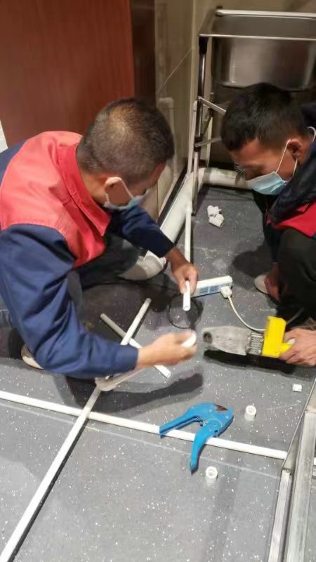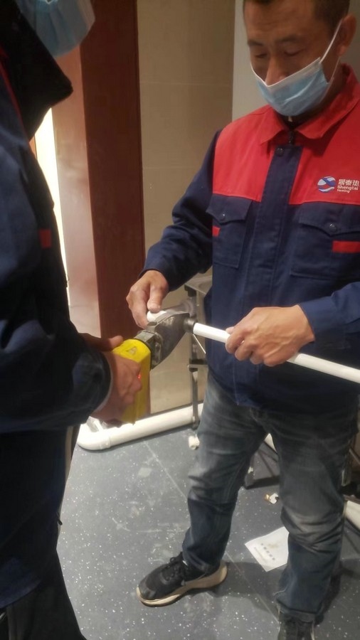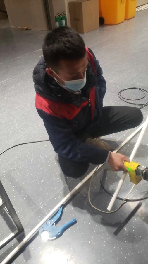 深夜,氣溫突降,冷風(fēng)毫不留情地灌入現(xiàn)場施工人員的衣服里,但無一人松勁、無一人退縮。由于材料分布范圍較大,只見身穿紅、藍(lán)工作服的他們徒步穿梭于各樓層之間,一刻不停地搬運(yùn)管件及材料、安裝設(shè)備。因疫情管控不能到現(xiàn)場的同事則堅(jiān)持利用通訊工具提供遠(yuǎn)程技術(shù)支持,為前線答疑解惑。方艙醫(yī)院建設(shè)屬于應(yīng)急工程,時間緊、任務(wù)重,加之現(xiàn)場材料缺乏,施工人員只能就地取材,爭分奪秒的同時,“突擊隊(duì)”表現(xiàn)出了高度的專業(yè)性,迅速、細(xì)致、高效地進(jìn)行管道鋪設(shè)和熱水器安裝……凌晨4點(diǎn),在現(xiàn)場全體施工人員的共同努力下,方艙醫(yī)院水暖安裝工作順利完成。