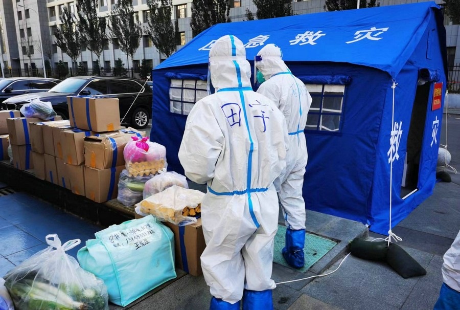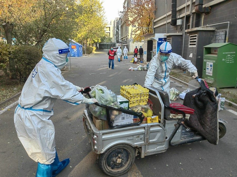 即使單元出現(xiàn)陽(yáng)性病例,田宇依舊穿著防護(hù)服,佩戴好口罩,第一時(shí)間將物資運(yùn)送到位。有時(shí)物資集中配送,田宇需要往返多次搬運(yùn)大量的物資。有時(shí)鄰居填錯(cuò)地址,還需要到別的居民樓幫忙找尋。但她從未有過(guò)一句怨言,面對(duì)鄰居們的感謝和贊揚(yáng),她總是憨厚地和大家說(shuō)“不要客氣”。當(dāng)鄰居們因?yàn)樾^(qū)的封控管理或物資短缺產(chǎn)生焦慮或不滿時(shí),她也會(huì)在第一時(shí)間解釋說(shuō)明,疏導(dǎo)大家的情緒。