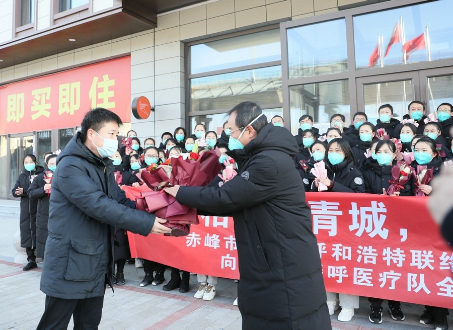 新華融媒、北疆新聞網(wǎng)消息(記者 張楊)“自呼和浩特疫情發(fā)生以來,50多個晝夜,白衣天使們逆行參戰(zhàn),奮戰(zhàn)在抗疫第一線,為呼和浩特保衛(wèi)戰(zhàn)貢獻了自己的力量,體現(xiàn)了白衣天使的責任和擔當,更展現(xiàn)了赤峰人奮勇拼搏的精神,圓滿完成了援呼醫(yī)療各項任務(wù),沒有辜負家鄉(xiāng)人民的重托,大家辛苦啦!”12月5日,在赤峰援呼普通病區(qū)醫(yī)療隊圓滿完成各項任務(wù),即將凱旋之際,赤峰市人民政府駐呼和浩特聯(lián)絡(luò)處和內(nèi)蒙古赤峰商會,共同到醫(yī)療隊駐地看望醫(yī)療隊員。赤峰市人民政府駐呼和浩特聯(lián)絡(luò)處副主任李子輝,代表駐呼聯(lián)絡(luò)處和內(nèi)蒙古赤峰商會在呼和浩特地區(qū)鄉(xiāng)友,向援呼醫(yī)療隊領(lǐng)隊羅俊祥等醫(yī)護人員獻上鮮花和對家鄉(xiāng)同胞的親切問候。