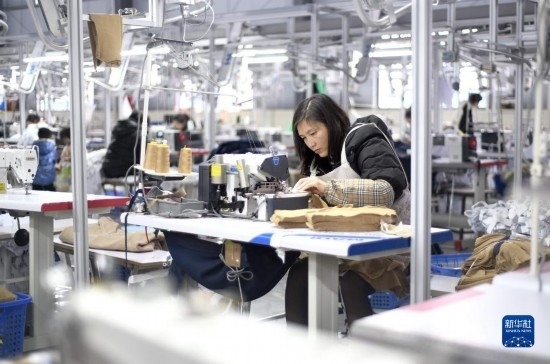 2月15日,工人在貴州省黔西南布依族苗族自治州安龍縣一家服裝企業(yè)生產(chǎn)車間加工服裝產(chǎn)品。