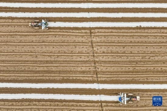 2月16日,村民在湖北省武漢市經(jīng)開區(qū)鄧南街田間進行播種作業(yè)(無人機照片)。