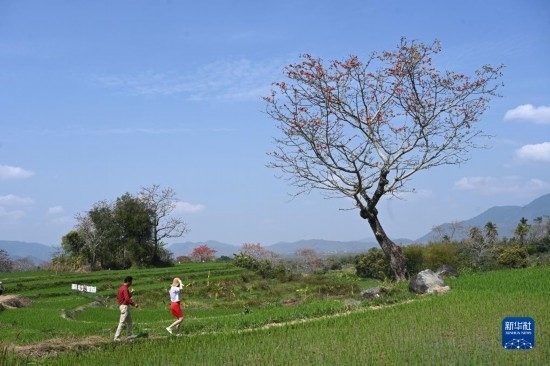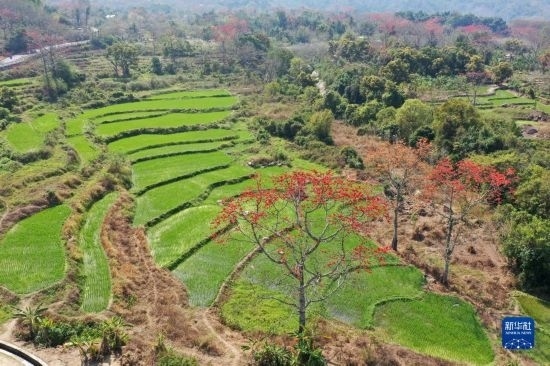 這是在海南昌江拍攝的梯田與木棉花(2月17日攝,無(wú)人機(jī)照片)。