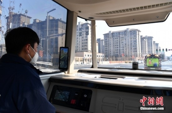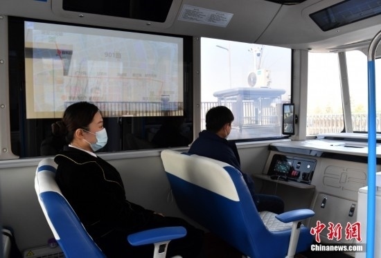 2月22日,智能網(wǎng)聯(lián)巴士901線測試車輛準備發(fā)車。雄安新區(qū)的智能網(wǎng)聯(lián)巴士近期正在進行投入運營前的道路測試,該巴士配備了超高感度攝像頭、超聲波雷達、激光雷達、毫米波雷達等感知設(shè)備,組成了車輛的“眼睛”。車輛可自主識別紅綠燈、道路提示牌和車道標線等,做出跟車、超車、停車等動作。中新社記者 韓冰 攝