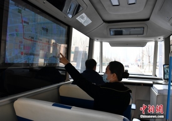 2月22日,智能網(wǎng)聯(lián)巴士901線測試車輛測試員正在介紹公交路線。雄安新區(qū)的智能網(wǎng)聯(lián)巴士近期正在進行投入運營前的道路測試,該巴士配備了超高感度攝像頭、超聲波雷達、激光雷達、毫米波雷達等感知設(shè)備,組成了車輛的“眼睛”。車輛可自主識別紅綠燈、道路提示牌和車道標線等,做出跟車、超車、停車等動作。中新社記者 韓冰 攝