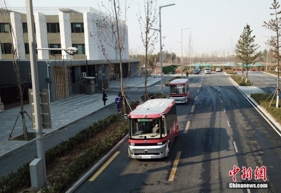 2月22日,智能網(wǎng)聯(lián)巴士901線測試車輛與普通城市公交車駛出公交站臺。雄安新區(qū)的智能網(wǎng)聯(lián)巴士近期正在進行投入運營前的道路測試,該巴士配備了超高感度攝像頭、超聲波雷達、激光雷達、毫米波雷達等感知設(shè)備,組成了車輛的“眼睛”。車輛可自主識別紅綠燈、道路提示牌和車道標線等,做出跟車、超車、停車等動作。中新社記者 韓冰 攝