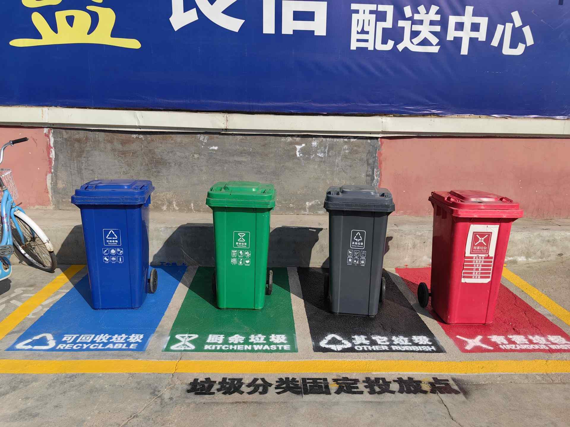 當(dāng)日下午,記者來到農(nóng)貿(mào)市場西門,只見紅、綠、藍、黑四種分類垃圾桶整齊陳列,地面上畫了對應(yīng)顏色的標識和投放垃圾類別的文字簡介,“垃圾分類固定投放點”幾個大字非常顯眼。像這樣的“地標”市場里不止一處,在農(nóng)貿(mào)市場北門,工人們正在給“垃圾分類投放地標”噴漆,南門西側(cè)的“地標”也完成了基礎(chǔ)設(shè)置。此舉旨在完善分類垃圾桶宣傳告知功能,讓更多人清晰了解分類垃圾桶的具體功能,防止垃圾混投,實現(xiàn)精準投放。