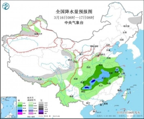 3月16日08時(shí)至17日08時(shí),黑龍江東部、新疆沿天山地區(qū)和伊犁河谷、西藏東南部、青海東部和南部、甘肅南部、等地部分地區(qū)有小雪。黃淮西部、江淮、江漢、江南北部、西南地區(qū)東部等地部分地區(qū)有中到大雨,其中,貴州東部、湖南西北部等地部分地區(qū)有暴雨(50~60毫米)。