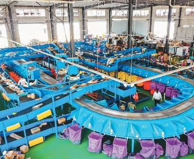 湖南省永州市藍(lán)山縣創(chuàng)品國(guó)際智慧物流園藍(lán)山星河物流科技有限公司的員工在智能分揀作業(yè)線上工作。 彭 華攝(人民圖片)