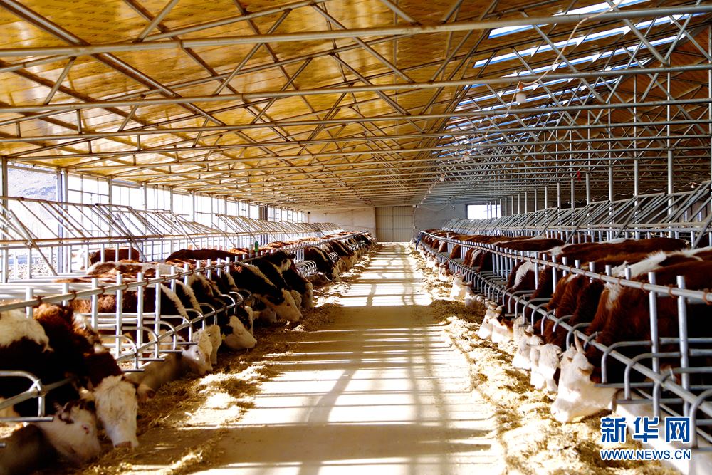 王喜良家的標(biāo)準(zhǔn)化牛棚暖意濃濃,膘肥體壯的肉牛正在吃草。新華網(wǎng)發(fā)(王呼斯冷 攝)