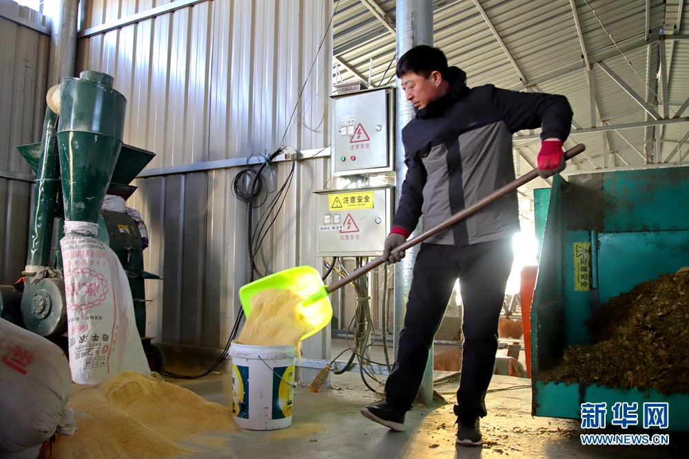 牧民羅布倉(cāng)在自家牛棚草料庫(kù)攪拌牛飼料。新華網(wǎng)發(fā)(韓飛 攝)