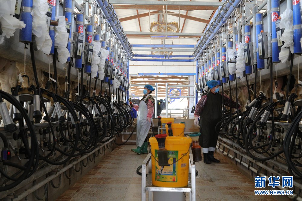 小黑山奶牛養(yǎng)殖專業(yè)合作社的工人在擠奶臺(tái)上擠奶。新華網(wǎng)發(fā)(白敖敏 攝)