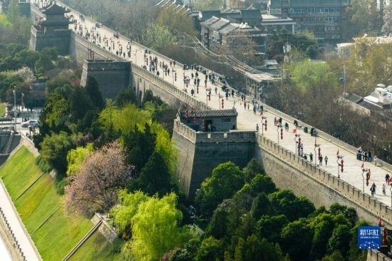 近日,陜西西安明城墻旁春意漸濃,吸引不少市民游客前來踏青。