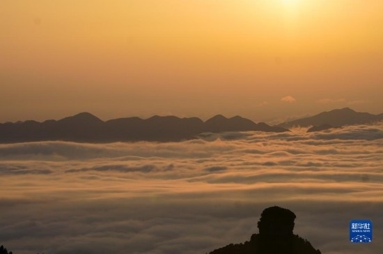 這是4月19日拍攝的金佛山日出時(shí)分的云海景觀。