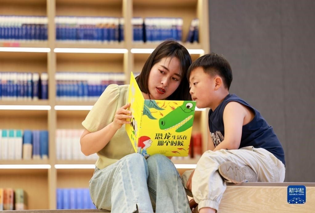5月2日,一名家長(zhǎng)帶著小朋友在江蘇省泰興市新時(shí)代文明實(shí)踐中心城市書房閱讀。
