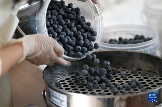 呂欣在挑選藍莓準備包裝(5月3日攝)。