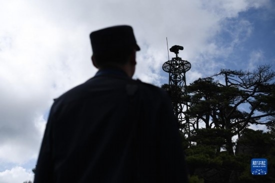 4月20日,在黃山風(fēng)景區(qū),瞭望哨防火小隊(duì)隊(duì)員汪新平在用望遠(yuǎn)鏡觀測(cè)山林。