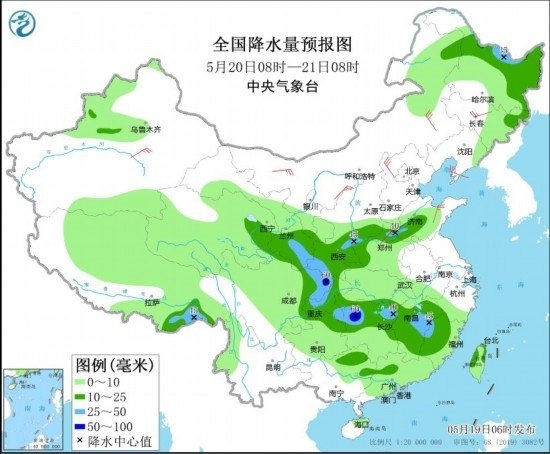全國降水量預(yù)報圖(5月20日08時-21日08時)。圖片來源:中央氣象臺網(wǎng)站