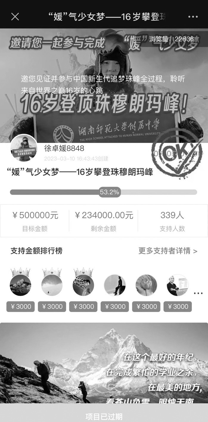 5月15日,揚(yáng)子晚報紫牛新聞記者再次點(diǎn)開徐卓媛當(dāng)初發(fā)起助力登峰的眾籌鏈接,發(fā)現(xiàn)該項目已過期,籌款進(jìn)度最終定格在53.2%,最終籌集到資金266000元。除去徐江雷朋友們贊助的這二十多萬元,據(jù)了解,還有一些企業(yè)也出資贊助了徐卓媛登頂珠峰的活動。徐江雷此前告訴記者,江蘇一家藥企看到此前揚(yáng)子晚報對于徐卓媛的報道后(本報今年3月17日刊登《眾籌50萬,助16歲女兒挑戰(zhàn)珠峰》一文),被她小小年紀(jì)敢于攀登高峰的精神所打動,秉承著“少年強(qiáng)則國強(qiáng)”的理念,慷慨贊助徐卓媛登山資金30萬元。