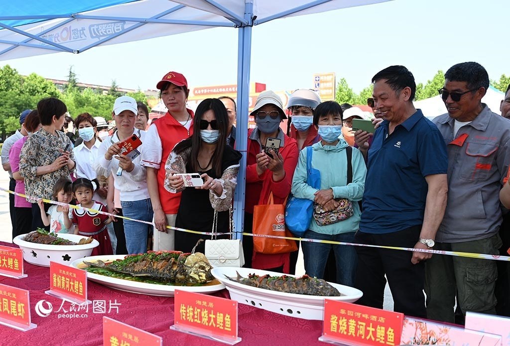 5月17日,“中國旅游日”主題周活動(dòng)期間,河南省義馬市舉辦“櫻紅五月”美食節(jié),集中展示當(dāng)?shù)氐奶厣朗场⒚麅?yōu)特產(chǎn),為了讓游客有更好的體驗(yàn),當(dāng)?shù)?2家飯店還進(jìn)行了精彩紛呈的廚藝大比拼。活動(dòng)現(xiàn)場,游客在圍觀經(jīng)典豫菜“紅燒黃河大鯉魚”。人民網(wǎng)記者 王玉興攝