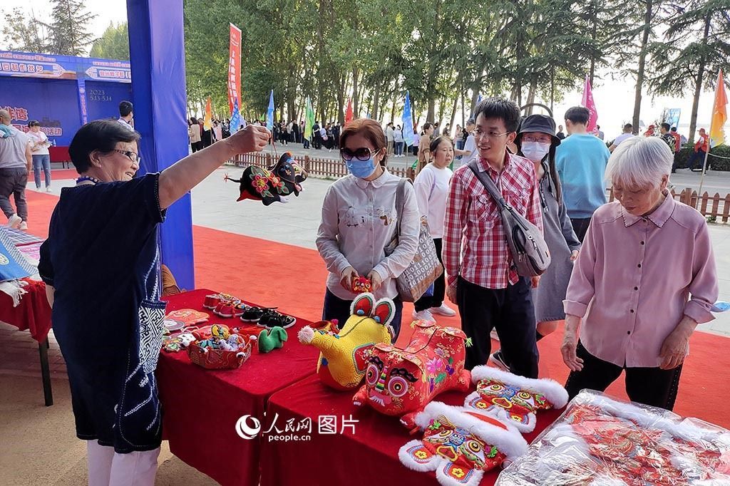 5月14日,“中國旅游日”主題周活動(dòng)期間,河南省三門峽市陜州區(qū)在黃河岸邊舉辦“傳承多彩非遺”魅力陜州非物質(zhì)文化遺產(chǎn)展演體驗(yàn)活動(dòng),大展傳統(tǒng)藝術(shù)魅力,為群眾獻(xiàn)上了一場“非遺文化盛宴”。在活動(dòng)現(xiàn)場,當(dāng)?shù)厥〖壏沁z傳承人向游客展示文創(chuàng)產(chǎn)品布老虎。人民網(wǎng)記者 王玉興攝