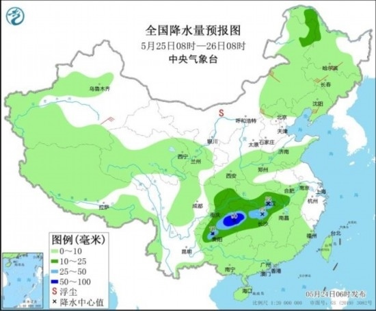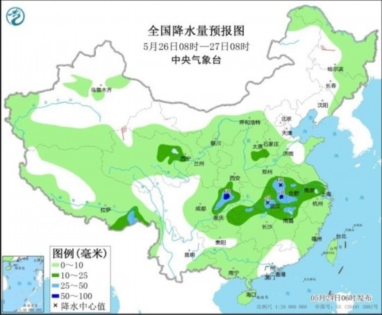 全國降水量預(yù)報(bào)圖(5月25日08時(shí)-26日08時(shí))