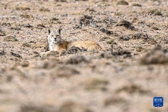 一只猞猁在阿爾金山國家級自然保護(hù)區(qū)休息(5月25日攝)。