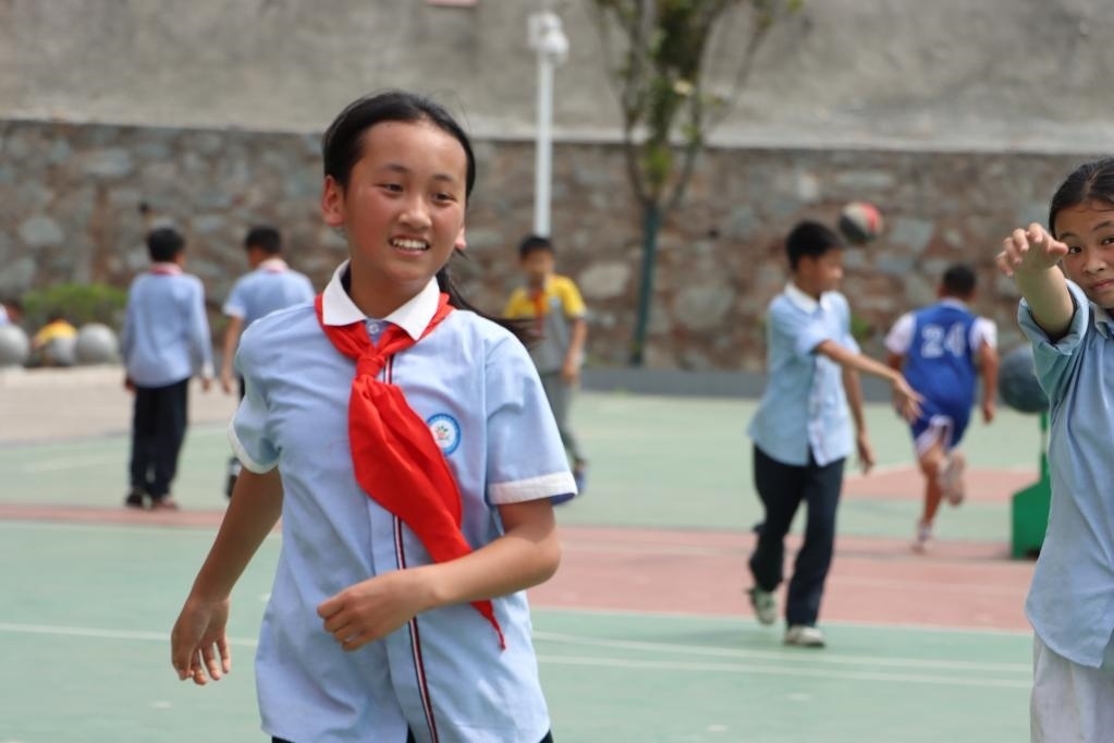 5月30日,貴州省榕江縣古州鎮(zhèn)第四小學(xué)四年級學(xué)生楊文源(右)在體育課上和同學(xué)一起打籃球。新華社記者 鄭明鴻 攝