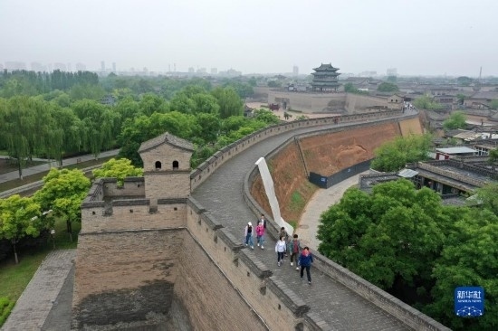 游客在平遙古城城墻上游覽(5月30日攝,無(wú)人機(jī)照片)。