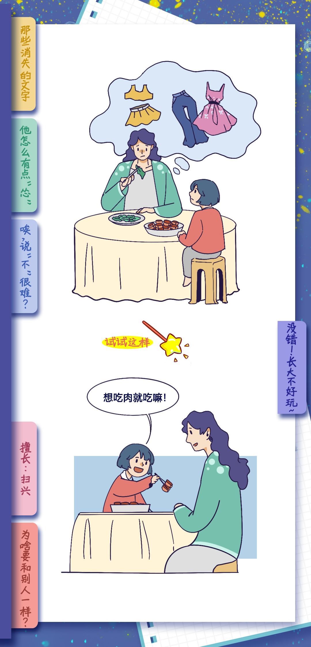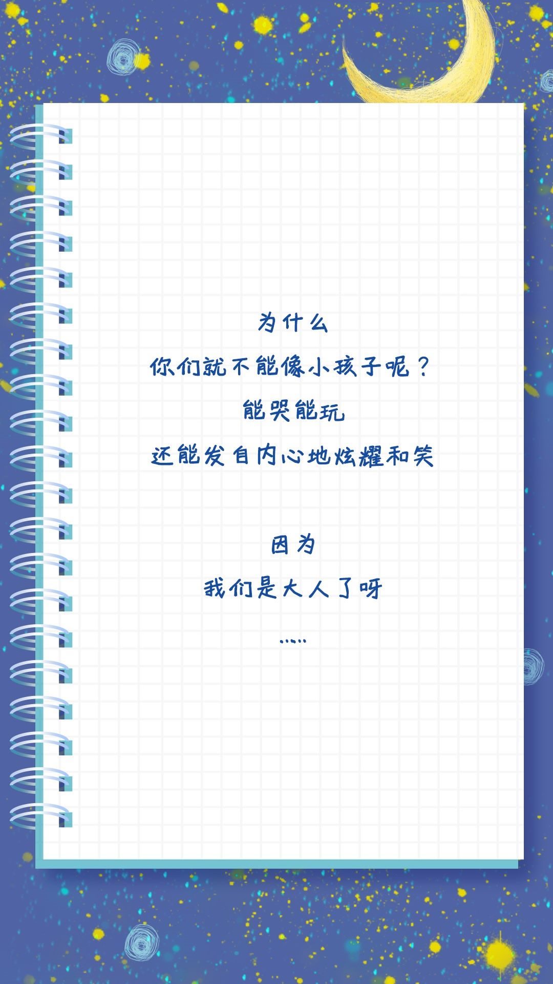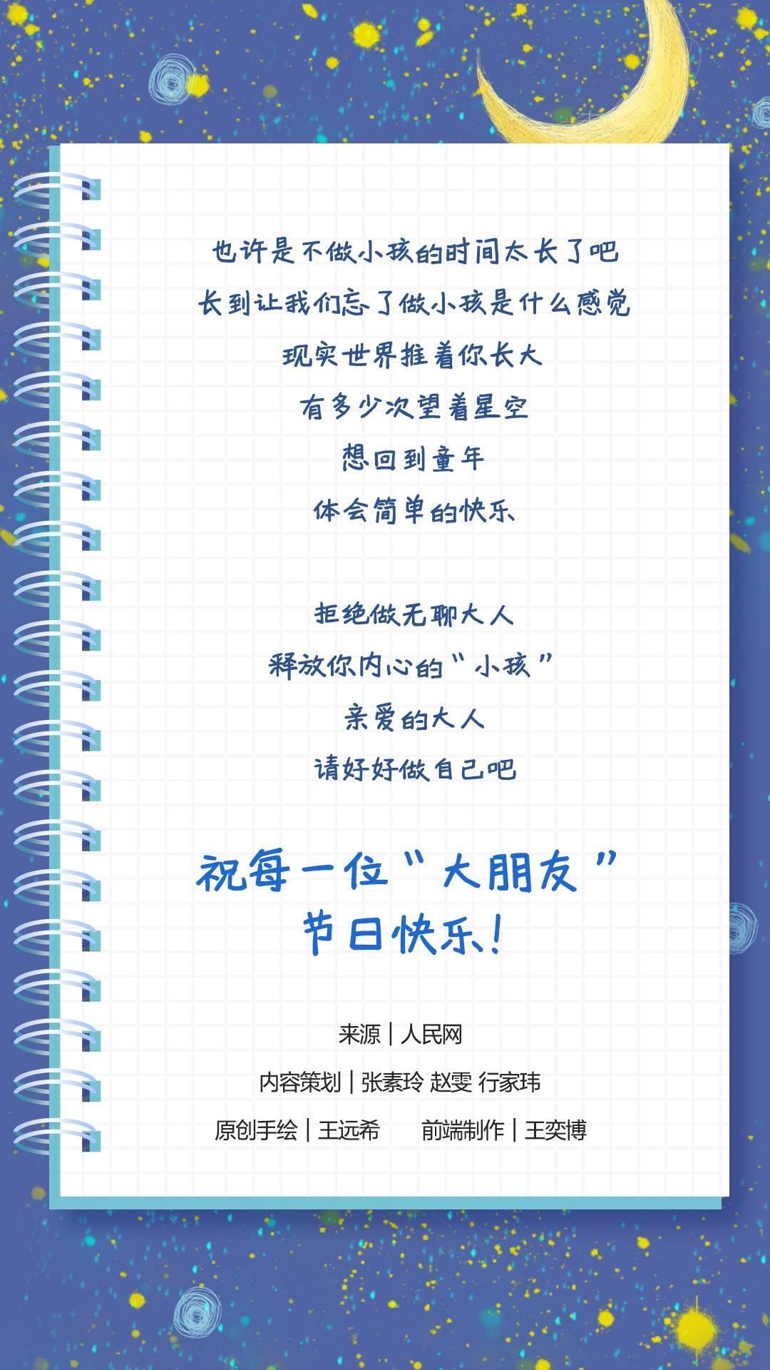 也許是不做小孩的時間太長了吧,長到讓我們忘了做小孩是什么感覺。現(xiàn)實(shí)世界推著你長大,有多少次仰望星空,想回到童年,體會簡單的快樂。拒絕做無聊大人,釋放內(nèi)心的“小孩”,親愛的大人,請好好做自己吧!祝每一位“大朋友”節(jié)日快樂!