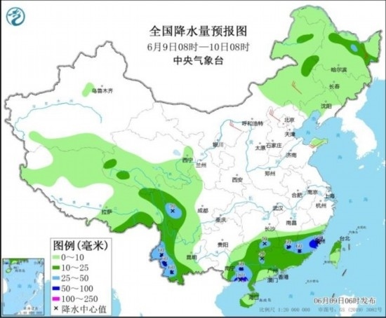 9日至11日,江南、華南、云南等地有中到大雨,局地有暴雨或大暴雨,小時(shí)雨量20~50毫米,局地可達(dá)60毫米以上;預(yù)計(jì)6月9日08時(shí)至10日08時(shí),廣西南部和東北部、湖南南部、江西南部、福建中南部、廣東西北部、云南西部、四川西部等地部分地區(qū)有大到暴雨,其中,福建東部沿海、廣西東南部沿海等地局地有大暴雨(100~180毫米)。上述部分地區(qū)伴有短時(shí)強(qiáng)降水,局地有雷暴大風(fēng)或冰雹等強(qiáng)對(duì)流天氣。中央氣象臺(tái)6月9日06時(shí)繼續(xù)發(fā)布暴雨藍(lán)色預(yù)警(見圖1)。
