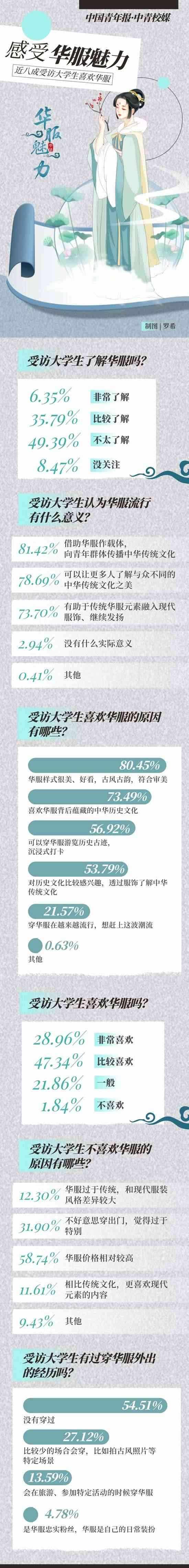 穿華服正在成為一些年輕人旅游或日常出行的選擇?!叭A服”,是指具有中華民族歷史文化基因、精神風(fēng)貌,且融合當(dāng)代審美的禮儀性服裝,其服裝風(fēng)格根植于中華傳統(tǒng)文化,傳承中華民族特質(zhì),體現(xiàn)當(dāng)代社會(huì)積極向上的時(shí)代精神,具有鮮明的辨識(shí)度,適用于國(guó)際交往、文化交流、商貿(mào)往來(lái)以及日常節(jié)慶、典祭等禮儀場(chǎng)合。自2018年起,每年的農(nóng)歷三月初三被選定為“中國(guó)華服日”,在前不久結(jié)束的第五屆“中國(guó)華服日”活動(dòng)中,上萬(wàn)名青年華服愛(ài)好者匯聚活動(dòng)現(xiàn)場(chǎng)參與體驗(yàn)。近日,中國(guó)青年報(bào)社·中青校媒面向全國(guó)高校大學(xué)生發(fā)起問(wèn)卷調(diào)查,共回收117所高校學(xué)生填寫(xiě)的有效問(wèn)卷1464份。調(diào)查結(jié)果顯示,76.30%受訪者表示喜歡華服,42.14%受訪者表示對(duì)華服有一定的了解。