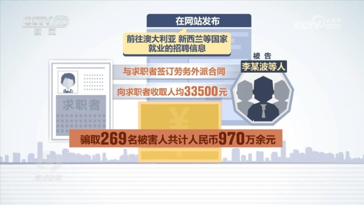 2023年5月,北京市房山區(qū)法院也判決了一起出國勞務(wù)詐騙案,被告李某波因詐騙罪一審判決13年6個(gè)月有期徒刑。判決書顯示:被告李某波等人冒用北京一家勞務(wù)派遣有限公司名義開展業(yè)務(wù),在網(wǎng)站發(fā)布前往澳大利亞、新西蘭等國家就業(yè)的招聘信息,與求職者簽訂勞務(wù)外派合同,向求職者收取人均33500元的費(fèi)用,最終騙取269名被害人共計(jì)人民幣970萬余元。檢察官還總結(jié)了這類詐騙案的幾個(gè)特點(diǎn)。