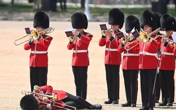 ·氣溫30度頭頂熊皮帽,三名衛(wèi)兵在英國王生日游行彩排被熱暈。