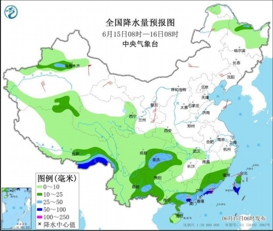 全國降水量預報圖(6月15日08時-16日08時) 圖自中央氣象臺網(wǎng)站