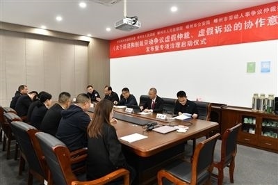 嵊州市委政法委、市法院、市檢察院、市公安局、市勞動(dòng)仲裁委聯(lián)合舉行《關(guān)于防范和制裁勞動(dòng)爭(zhēng)議虛假仲裁、虛假訴訟的協(xié)作意見》發(fā)布暨專項(xiàng)治理啟動(dòng)儀式。