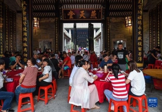 6月15日,2023年車陂龍舟競(jìng)渡第一名“范陽(yáng)簡(jiǎn)”龍船會(huì)在簡(jiǎn)氏家祠里擺下幾十桌龍船飯慶祝。