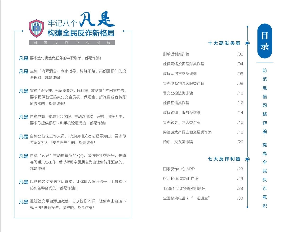 聚焦“關(guān)口前移、預(yù)防為先”,《手冊》詳細介紹了過去兩年里,公安部會同工信部、中國人民銀行聯(lián)合推出的七大反詐利器——國家反詐中心APP、96110預(yù)警勸阻專線、12381涉詐預(yù)警勸阻短信系統(tǒng)、全國移動電話卡“一證通查”、云閃付APP“一鍵查卡”、反詐名片、全國互聯(lián)網(wǎng)賬號“一證通查2.0”的主要功能和下載查詢方法,鼓勵廣大群眾多下載多使用,共同構(gòu)筑攔截電信網(wǎng)絡(luò)詐騙的“防火墻”。