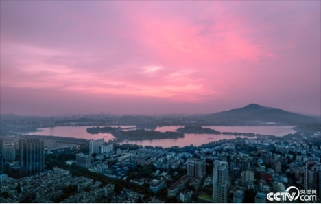 2023年6月16日,南京,玄武湖朝霞滿天,美不勝收。