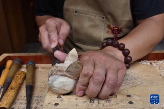 6月17日,一名手工藝人在貴州省鎮(zhèn)遠(yuǎn)古城一家木雕店雕刻工藝品。