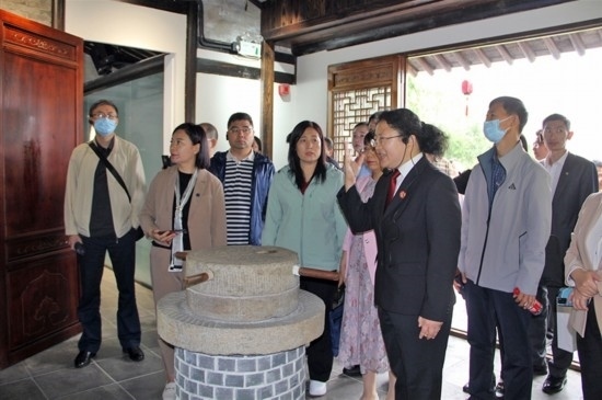 正值初夏,上海市奉賢區(qū)青村鎮(zhèn)吳房村,世外桃源般的江南水鄉(xiāng)風(fēng)貌引人入勝。沿著吳房村的青石板路,代表們一路考察、一路交流,從三治堂到四堂間,深入了解奉賢區(qū)法院訴源治理平臺“奉法客堂間”工作情況。