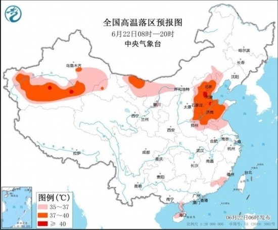圖2 全國高溫落區(qū)預(yù)報(6月22日08時-20時) 圖自中央氣象臺網(wǎng)站