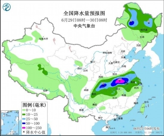 6月29日08時(shí)至30日08時(shí),內(nèi)蒙古東部、黑龍江西部和中部、四川盆地東部、重慶、陜西東南部、湖北、河南南部、湖南南部、安徽、江蘇等地部分地區(qū)有中到大雨,其中,內(nèi)蒙古東北部、河南南部、安徽中西部、湖北北部和西部、重慶東北部等地部分地區(qū)有暴雨或大暴雨(100~140毫米)。內(nèi)蒙古西部和東部、新疆北部等地部分地區(qū)有4~7級(jí)風(fēng)(見圖4)。