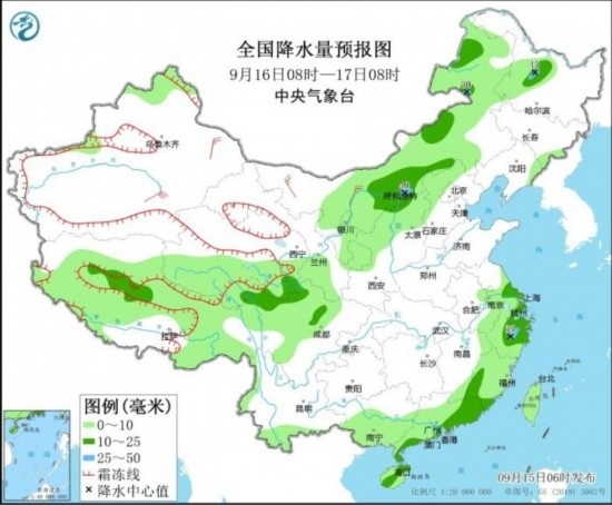 全國降水量預(yù)報(bào)圖(9月15日08時(shí)-16日08時(shí))