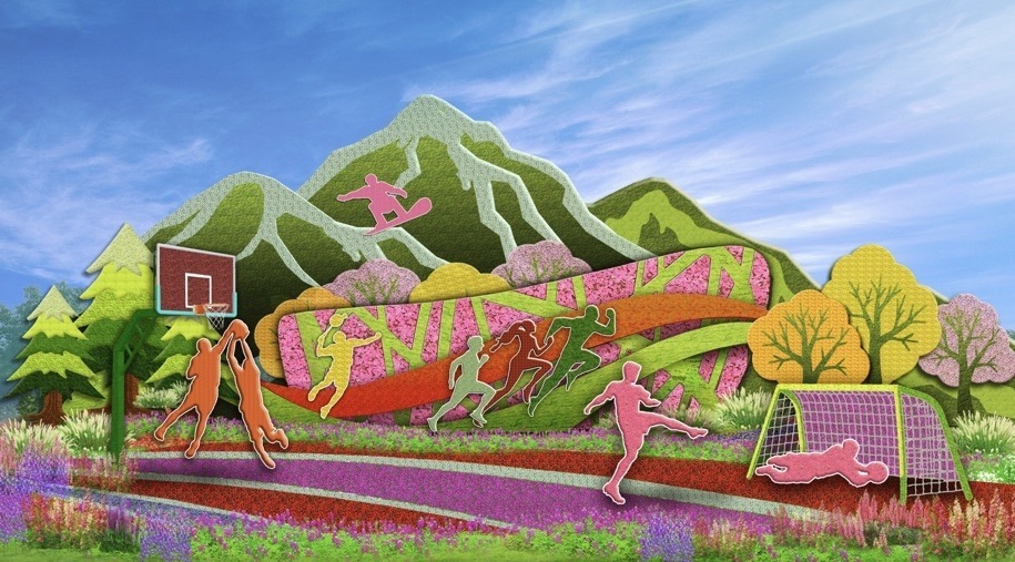 6,西單東北角的“全民健身”花壇頂高8.5米,以豐富多彩的全民健身為題材,配以籃球、羽毛球、跑步、滑雪等運動場景,寓意全民健身共享美好生活。